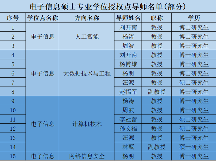 目前,电子信息专业硕士已经设置有计算机技术、人工智能、大数据技术与工程、网络信息安全四个培养方向,具体如下: