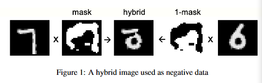 首先,这里的正样本并不是我们常理解的分类算法里的正负样本的正样本。而是你训练集带有标签的样本,假设是二分类任务,这个正样本可以是0也可以是1。而这里的负样本就是非正样本的其他样本,都是负样本。可以自造假数据,也可以网络自身生成的假数据。比如在手写体数字MNIST识别中,将正确数字叠加掩码图片得到图片A,再找个非正确数字图片叠加(1-掩码的图片)得到B,再将A和B叠加,这就是负样本了,如下图所示。