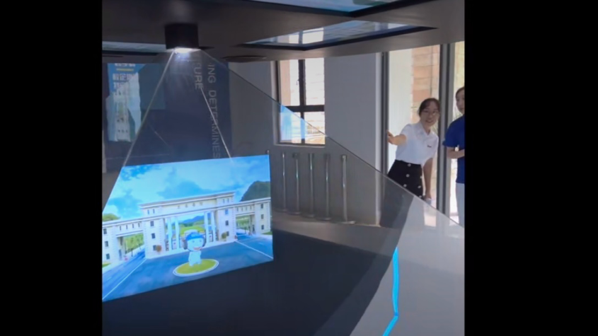 直播伊始,镜头聚焦公司广场的360°全息投影悬空展示平台,虚拟动画角色“吉娃”生动演绎吉利集团在新能源汽车、自动驾驶领域的技术突破。乔艳炎老师介绍:“这是虚拟现实技术专业师生自主研发的成果,体现了‘产教融合’的深度实践。”