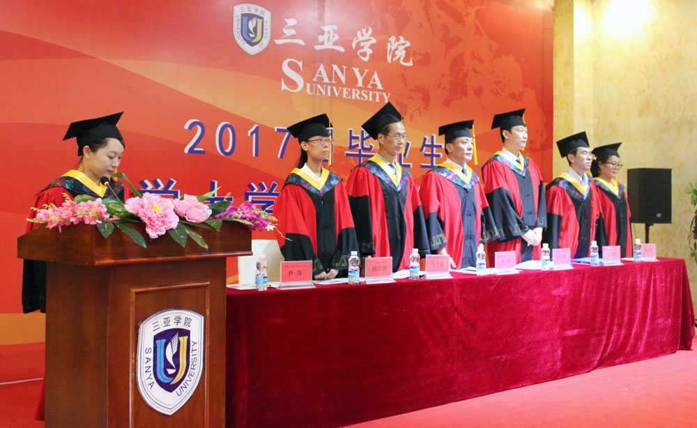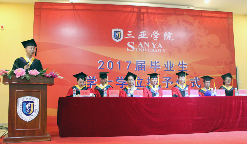 在主持人宣布仪式开始,介绍出席领导嘉宾、学位委员会成员之后,毕业典礼在庄严的国歌声中拉开帷幕。弓千让教授宣读《关于授予hy3380cc海洋之神2017届毕业生学士学位的决定》之后,学位委员会成员为毕业生颁发学士学位证。