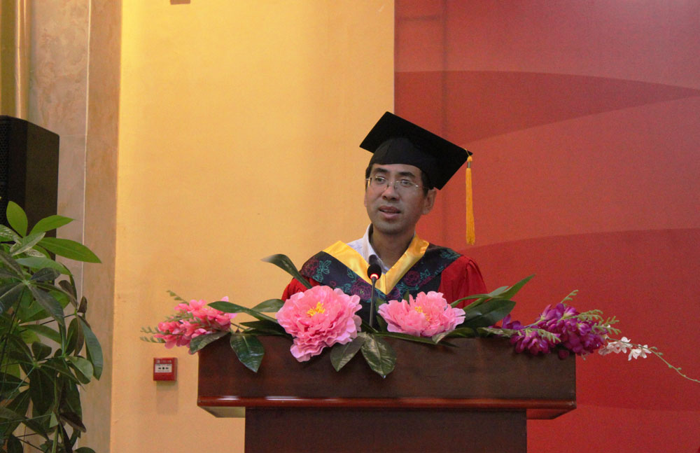 导师代表王明松老师发言,在发言中,王明松老师说“校园里穿学位服的同学多了,不会喝酒的同学也喝醉了,难得流泪的人也哭了”,这是个充满感伤的日子,王明松老师回忆了大学期间的师生情,并向毕业生表示衷心感谢和诚挚祝福,祝福毕业生顺利起航,在新的人生征程中,载着对未来的美好憧憬和向往,乘风破浪、扬帆远航。