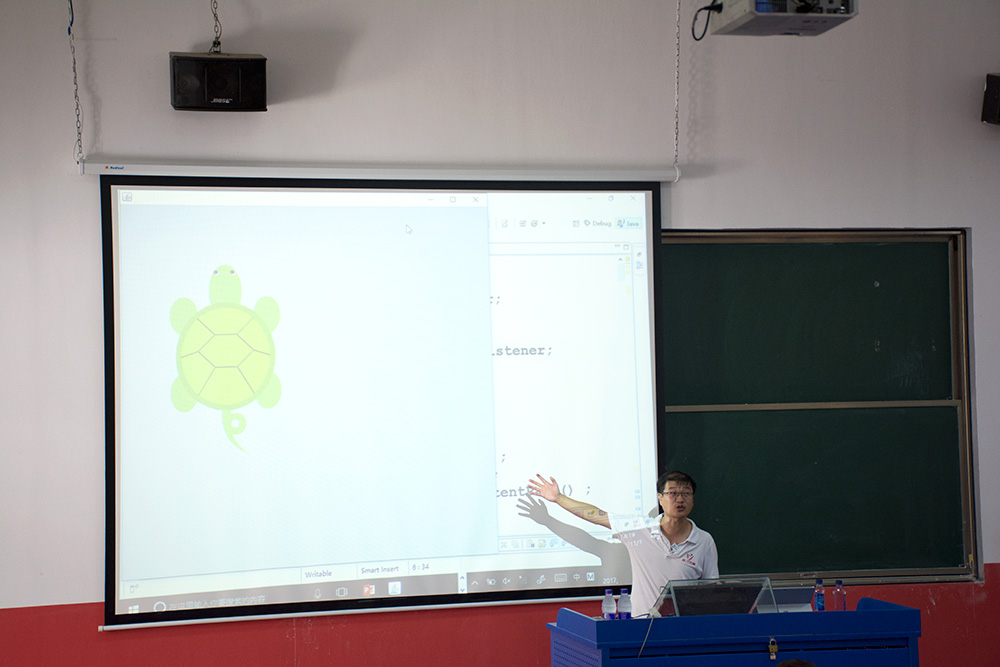 此次讲座上,王洋老师运用自己独创的“基于员工认知曲线的项目驱动教学法”教学方式。通过一节标准JAVA案例课程,以诙谐幽默、别具一格的授课风格,实时编写讲解代码,通过实践的编程操作带给同学们直观的编程感受,以绘制活泼的乌龟,漂亮的星空、大家熟悉的雷电游戏等多样化的应用操作得到了同学们热烈的掌声。同时讲解了JAVA代码编写的录入顺序及要领,帮助公司员工掌握了编程语言学习技巧。