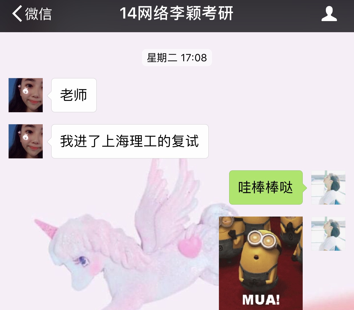 3月20日下午李颖同学兴奋地给思想导师彭婷发了一条微信,说她过了上海理工大学的初试,进入复试环节了。彭老师立即把这个消息告诉公司领导,引起公司领导的高度重视,公司刘开南经理当即通过电话指导,向李颖同学传授了复试的一些技巧和注意事项。