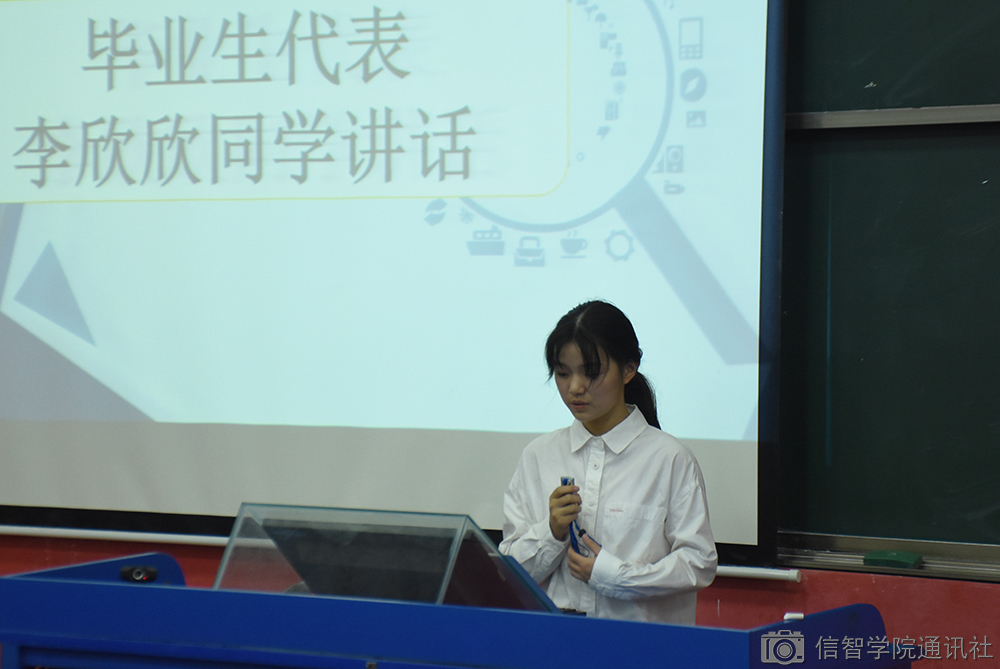 大会第三项:17级毕业生代表李欣欣同学发表讲话,她先是向辛勤培育员工的老师表示最衷心的感谢,向辛苦操劳的父母表示崇高的敬意,向四年来一起朝夕相处的兄弟姐妹们表达最真诚的祝福。回首在校四年的点点滴滴,充满太多的不舍,可老员工活终将要画上圆满的句号。相信同学们一定会继续秉承“自立更生,合力更新,有容乃大,不懈则优”的校训,运用四年所学的知识,勤于实践,踏实做事,在不同的工作岗位上为母校增光添彩,用努力来回报社会,回报国家。
