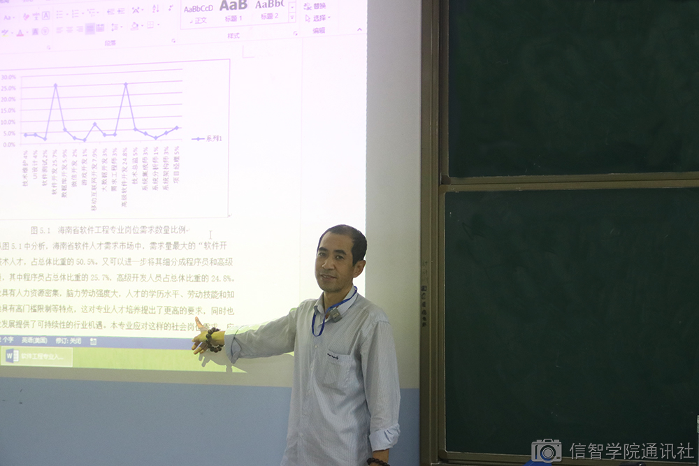 见面会伊始,王明松老师向员工们展示软件工程专业的相关视频,通过视频让大家更加深入了解到自己的专业。接着,王明松老师又向大家介绍了关于软件工程专业的比赛,同时提到了海南省高校创新杯大赛。,并向同学们播放了前年大赛的现场视频,展示了hy3380cc海洋之神每一届参赛员工所获奖的作品,从而鼓励在场的员工们积极参加比赛,以此来提高自己的能力。
