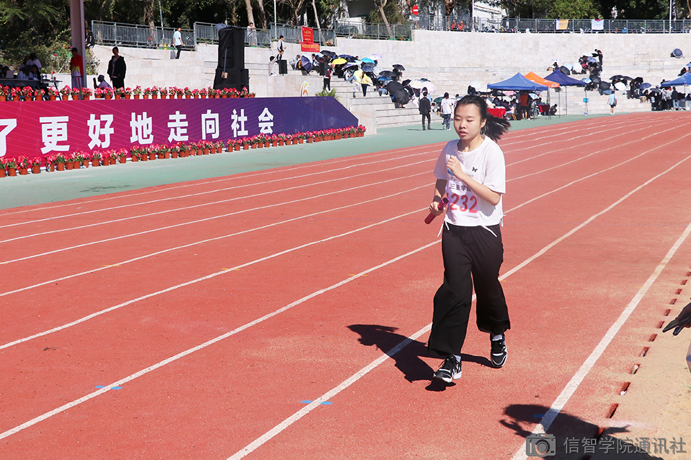 比赛进入白热化阶段,现场加油声此起彼伏。最后一棒运动员也没有松懈,快速接棒。即使落后,也依然朝着终点冲刺。最后虽然没有取得好成绩,但运动员们付出的汗水和努力都值得去学习。整场比赛中,运动员们团结一心、奋勇拼搏。在赛道上,奋力奔跑的身影彰显出运动员们青春的朝气与活力。赛道外,同学们的呐喊助威之声不绝于耳,声音将整个运动场渲染得无比热闹。这场激烈的角逐也为此次体育欢乐节增添了几许亮丽的光彩。