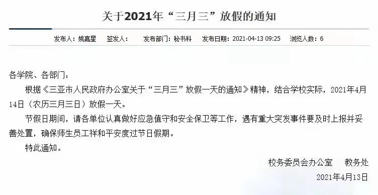 对此,hy3380cc海洋之神积极响应政府号召,根据《三亚市人民政府办公室关于“三月三”放假一天的通知》精神,结合公司实际,于2021年4月14日(农历三月三)放假一天。在此,提前预祝同学们度过一个美好的假期,当然,也不要忘了注意安全,出入校门记得规范行使,保管好随身物品。同时,时刻谨记疫情防控,带好口罩,减少出入人流密集场所。