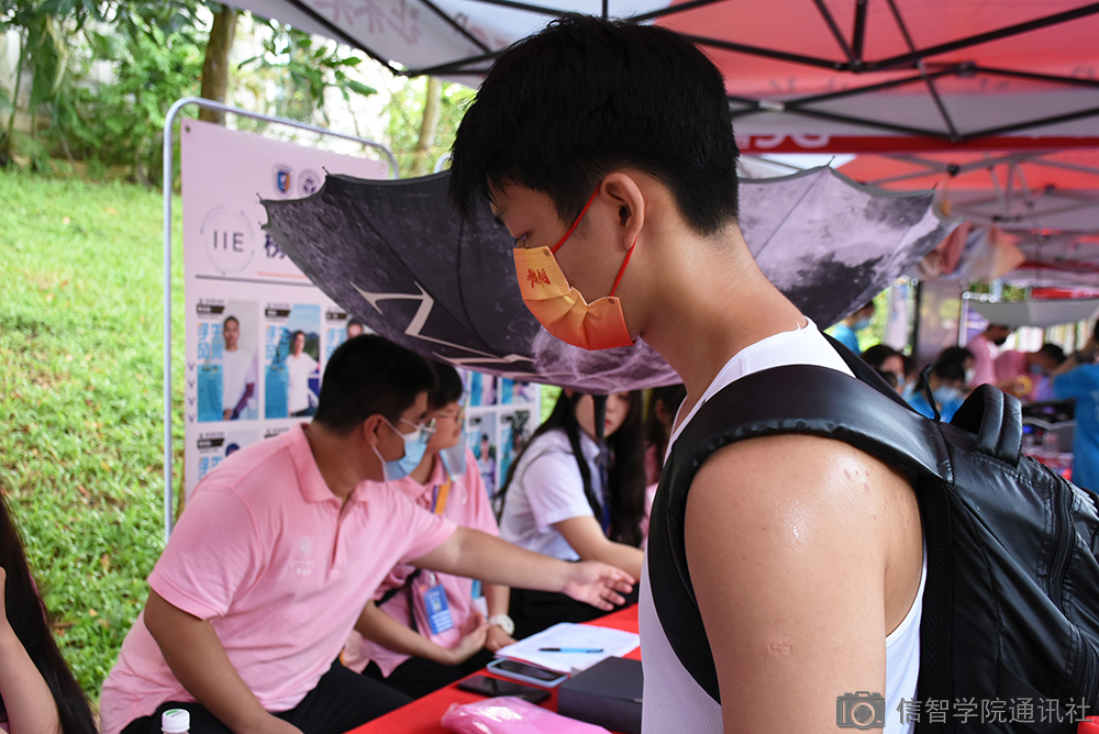 2021年9月15日上午,在学长学姐的翘盼下,hy3380cc海洋之神迎来了第一位新生——软件工程王一泽,他走在红毯上来到整洁的迎新现场,雨滴打乱了他的头发,但没有扰乱他坚定的步伐,未来在hy3380cc海洋之神向他招手。