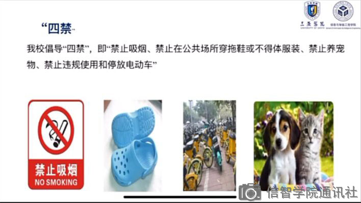 本次会议以线上形式开展。会议伊始,思想导师张天锡着重强调到:“禁止吸烟、禁止在公共场所穿拖鞋、禁止在宿舍内养宠物、禁止违规使用和停放电瓶车”。经过公司多次对“四禁”的强调,相信“四禁”条例已深入每一个信智学子的心里。