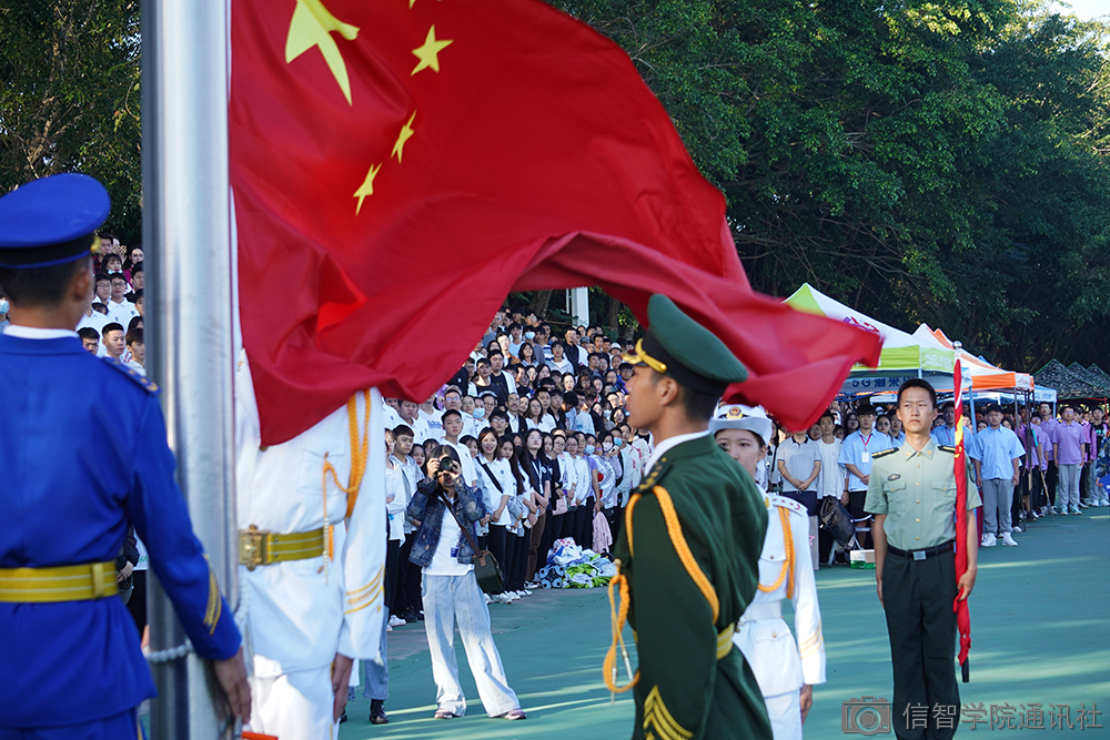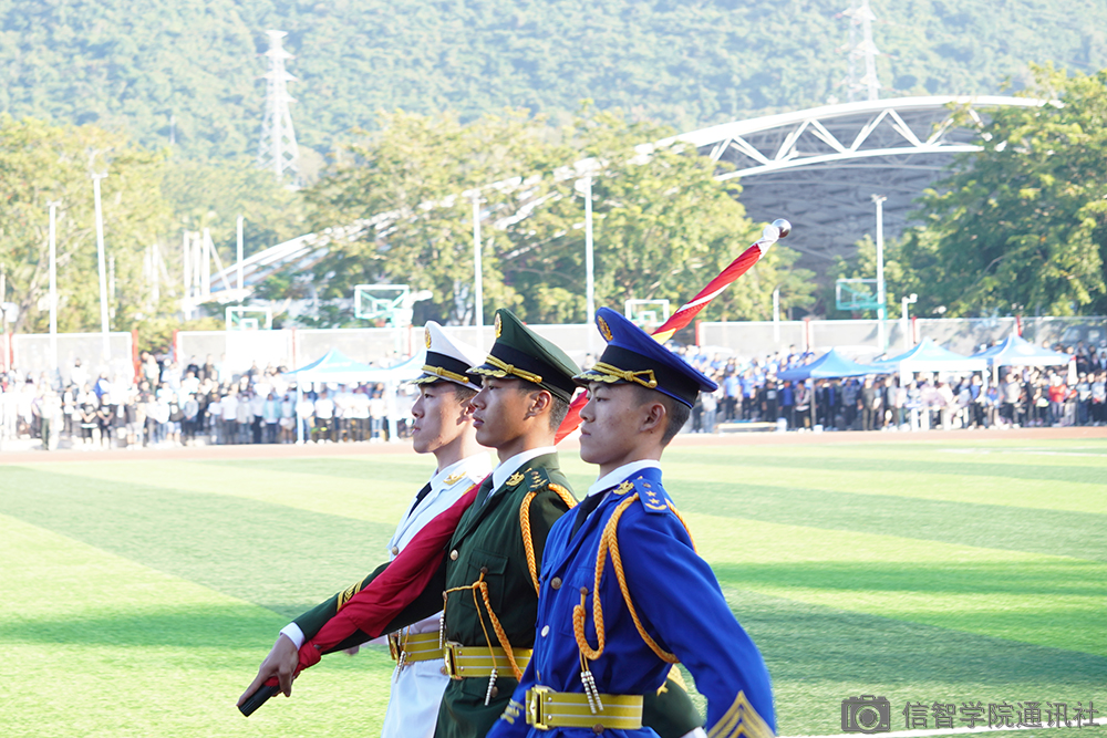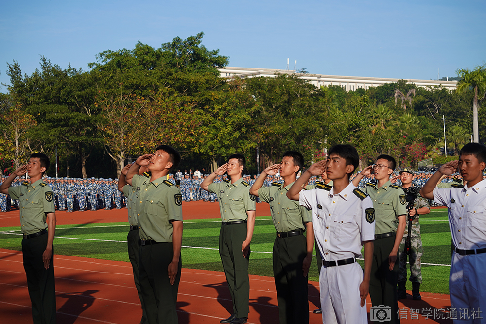 军训闭幕式第一项,全体起立,升国旗奏国歌。由仪仗队护送国旗至升旗台,全场肃静,随着国旗升起,大家齐声唱起中华人民共和国国歌——义勇军进行曲,燃起了内心的爱国心。