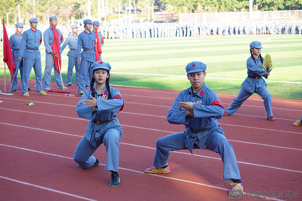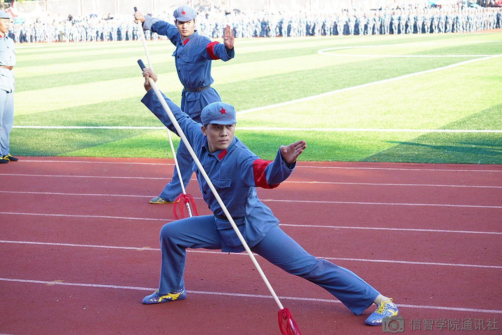 一阵狼烟四起,军训项目组的表演来临,在烟雾缭绕的草地上砸地、打棍、格斗,如军事演练般展现军人素养,令人连连惊叹。“杀”声响彻操场,男女双方从两边跑向操场中间,展现新生军训成果——军体操,军体操不仅可以加强新兵的体魄,还可以掌握格斗技巧。盾牌操、击棍操、长枪操充分展现了新兵的军人气势和这段时间的训练成果,用狼烟更加真实地模拟军训演习现场,让新兵身临其境体会战争现场。
