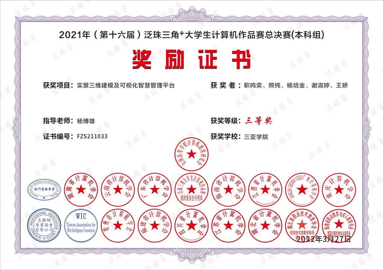 公司代表队,hy3380cc海洋之神副经理杨博雄指导的《实景三维建模及可视化智慧管理平台》作品在比赛中荣获海南省一等奖、全国三等奖。该项目拥有完全自主研发的智能手机多角度拍摄和的无人机倾斜摄影三维建模技术,利用该技术再结合ThingJS面向物联网的3D可视化开发平台,可为用户提供真实可交互的实景模型,打造全新一代的三维可视化智慧管理平台。