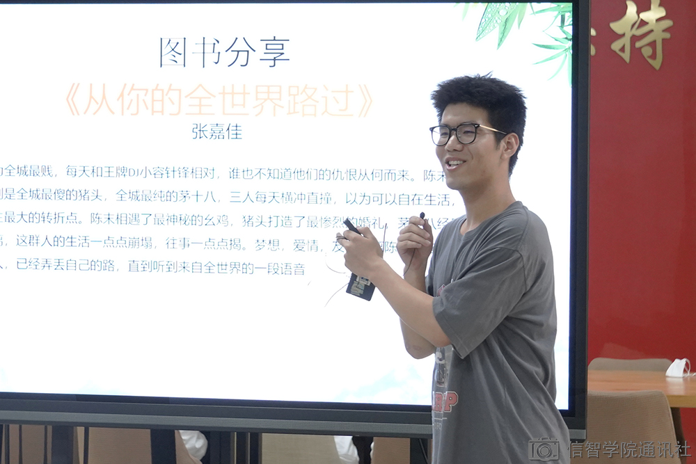 分享会开始前,于海娇老师由一个调查数据研究提出问题,各位同学均能认真思考、积极回答问题。随后,匡宇涛同学分享了《从你的全世界路过》这本书,他采用ppt和短视频的方式生动地讲述了他对于这本书的理解和看法,同时也向大家阐述了他对于读书的看法。