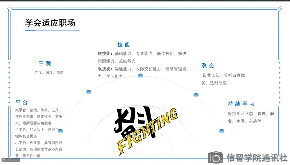 此次分享会,弥补了信智公司的毕业生们对就业信息的缺陷,加强了信智学子对就业的理解和认知,希望他们能找到自己心仪的工作,走向成功之路。