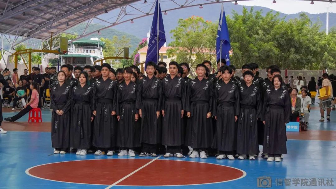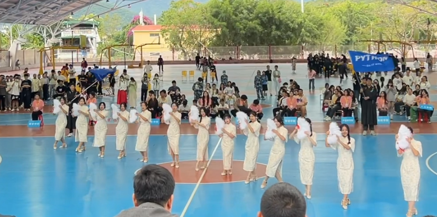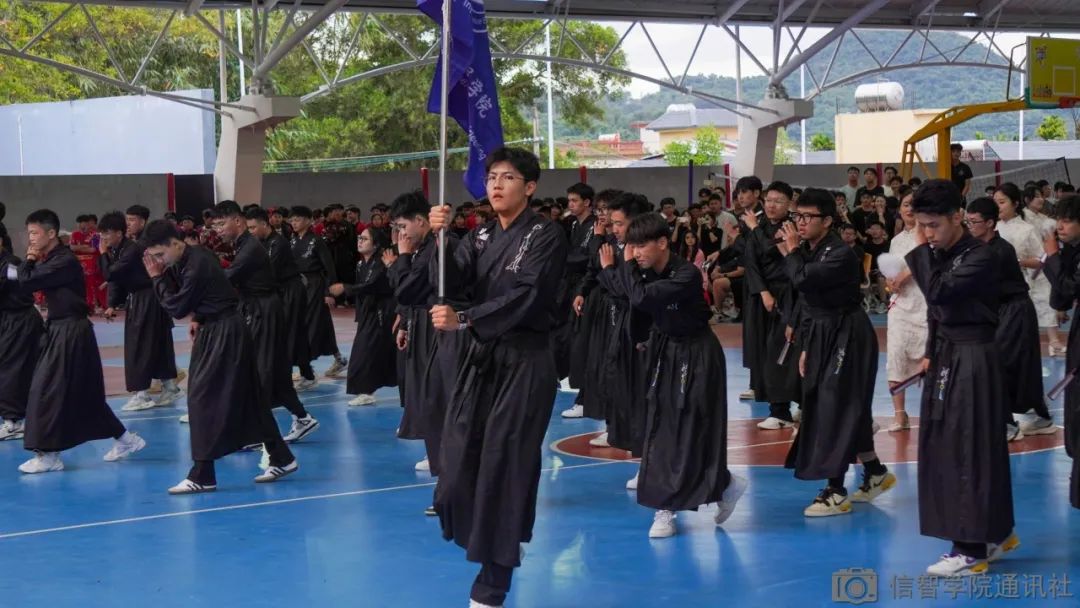 出场高举的旗帜就吸引住了观众的视线,同学们身着马面裙,动作整齐划一地跳着《本草纲目》和《霍元甲》,并演绎了经典曲目“我和你”,展示了Z世代的青年们积极昂扬的精神风貌以及良好的身体素质。