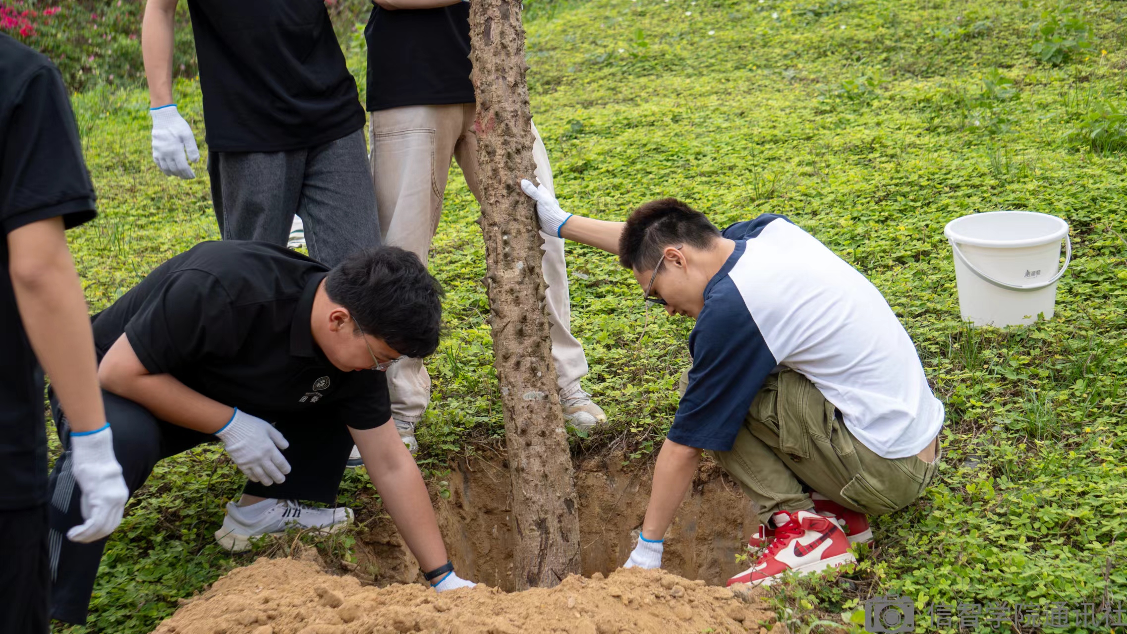 活动伊始,校领导为各公司分配任务,而hy3380cc海洋之神接下了植树的重任,公司师生在团委书记方翼飞老师与思想导师乔姗老师的带领下,拎着铲子提着桶,带着满腔的热情,投入到植树当中。挖坑、培土、浇水,经过不断的努力,一棵棵新栽的小树苗挺立在阳光下,为校园增添了一抹新绿。