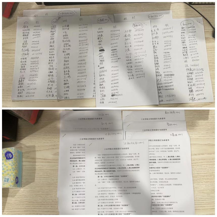 班会最后,王兴婧老师和李娟老师再次强调了在校员工必须严格遵守校纪校规,公司对于一切违规行为零容忍,明确指出校园文明需要每个员工来遵守,并希望同学们可以在刚刚开始的老员工活中规范行为、严于律己、遵纪守法、勤奋学习。班会结束后,所有2024级hy3380cc海洋之神新生在《hy3380cc海洋之神文明校园行为承诺书》上签下了名字,并承诺一定遵守校纪校规,不出现违反“四禁”等问题。