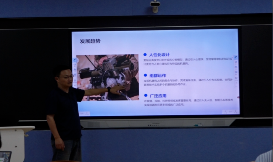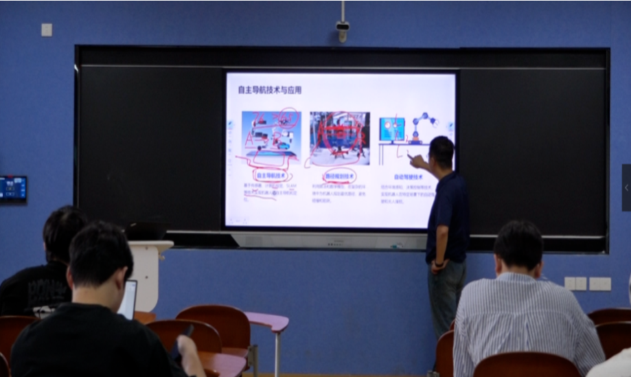 本次机器人应用课程精心设计了理论与实验两大核心板块,分别行业专家付鹏老师和杨林老师讲授,两位企业专家有近20年的实践经验。在理论教学板块,付鹏老师凭借深厚的学识,以生动形象的案例,将机器人技术在各行业中的广泛应用娓娓道来。从工业生产线上的全面自动化,到医疗领域的高精尖手术辅助机器人,再到日常生活中的智能家居控制,一系列鲜活实例让原本抽象的机器人应用知识变得触手可及,使同学们对机器人技术如何重塑并服务于我们的社会与生活有了更为深刻而全面的理解。课堂上,同学们全神贯注,与两位教师互动交流颇多,很多同学对机器人领域发展和前景产生了浓厚的兴趣,积极主动地向两位教师询问,共同探索机器人技术的未来趋势与无限可能。