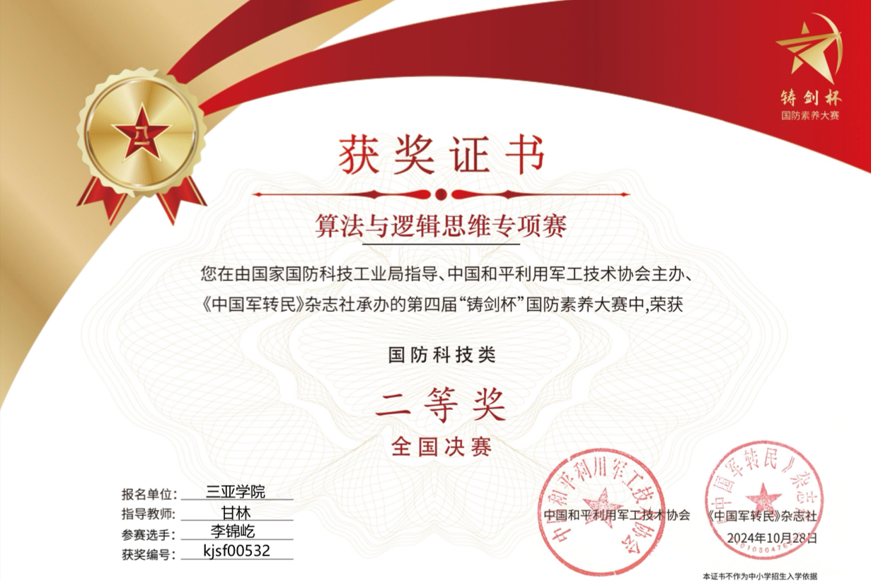在本届大赛中,算法与逻辑思维专项赛作为国防科技单元的重要组成部分,旨在考察员工的算法设计与逻辑思维能力,推动国防科技领域的人才培养和创新发展。李锦屹同学凭借扎实的专业基础和出色的表现,在众多参赛者中脱颖而出,荣获二等奖。