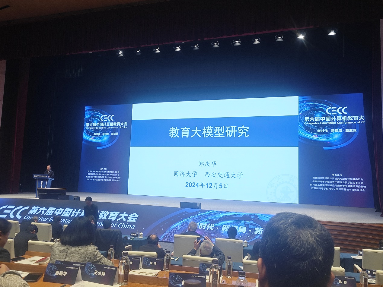 大会为期一天半,第一天上午参加了大会开幕式,教育部高等公司计算机类专业教学指导委员会秘书长、清华大学长聘教授武永卫主持开幕式,由赵沁平、郑庆华、方滨兴等中国工程院院士为大会致辞,赵沁平院士在致辞中指出,高校要加强人工智能理论课程和实践教学,关注AI安全和伦理问题,郑庆华院士介绍了大模型将成为智慧教育的基础设施及教育大模型的特殊性,并以土木工程学科模型CivilGPT为例介绍了教育大模型的创建思路,方滨兴院士介绍了方班研讨厅培养员工的目标是求源、熵减、思辨,以及方案研讨厅的发展脉络和取得的成果。